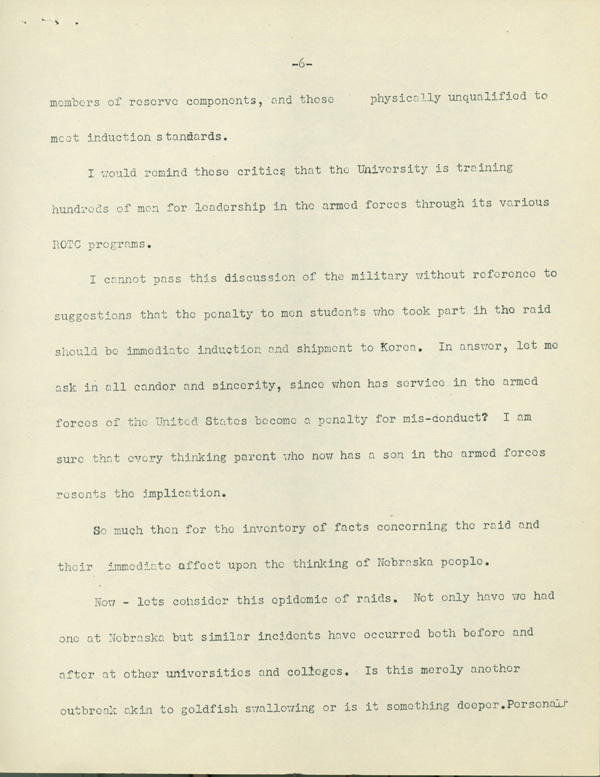 Late one night in the spring of 1952, a water fight broke out when the Phi Kappa Psis threw water at the Alpha Omicron Pis and the Kappa Alpha Thetas. The members of the houses began a good natured fight and crowds of other Nebraska students (and some high school students) got involved in the melee. The water fight quickly turned into a mob scene. Thirteen sorority houses and a dorm were broken into, each estimating over $500 in damages and stolen property. The Women's dorm was stormed twice and some people were physically hurt. The riot caused a sensation throughout the state and made newspapers nationwide. Dean Gustavson was swamped with mail and phone calls from concerned citizens in what turned out to be a PR nightmare for the University. He took swift action with any and all perpetrators and the event came to be a defining moment in his tenure as Dean.