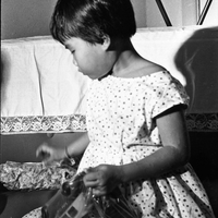 US Military Christmas event A young Vietnamese girl holds a toy car in one hand and reaches for another present with the other.