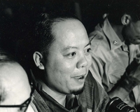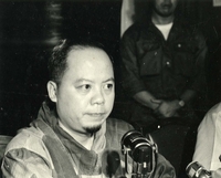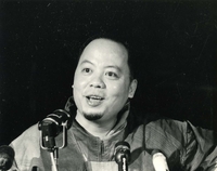 Original caption: "Students wrecking min. of info." An enormous group of people. Those on lower ground take a seat. A man with a staff adresses the crowd.