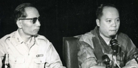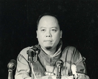 Original caption: "Students wrecking min. of info." An enormous group of people. Those on higher ground seem calm while those below have their hands in the air in various gestures of anger. There is a South Vietnamese flag.