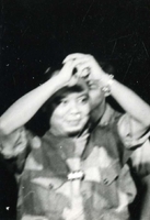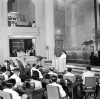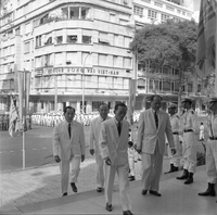 Original caption: "MDO Addressing Nat'l Ass. Oct 7, 1963" A group of men are walking into a building. Many men in uniform are seen standing on the street in the background.