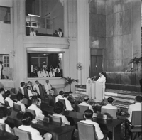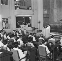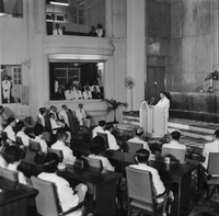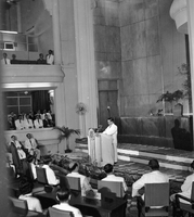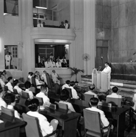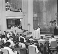 Original caption: "MDO Addressing Nat'l Ass. Oct 7, 1963" A man is standing at the podium as a crowd listens on.