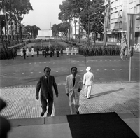 Original caption: "MDO Addressing Nat'l Ass. Oct 7, 1963" Two men walk up a flight of stairs. Soldiers stand at attention in the background.