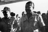 Trip with Nguyễn Cao Kỳ to Montagnard Ceremony, Pleiku. Vietnamese military officers sit on a stage and there is a large crowd of soldiers behind them.