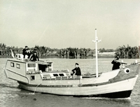 Two American soldiers are looking through a photo album with a young Vietnamese child. One soldier is holding the album as the other kneels behind the child.