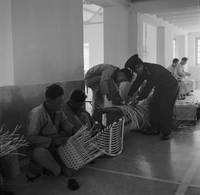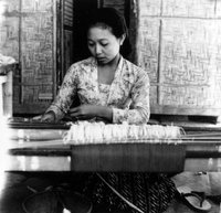 Original title: "Indonesian Arts and Crafts Negs [Negatives]." An Indonesian woman sits behind a loom and weaves a piece of cloth. From a scrapbook page 10.