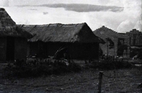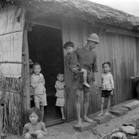 Original title: "VN Life", A man stands with five small children in the doorway of a traditional wood home with a tatched roof. There appears to be a pile of coconut husks in front of the house.