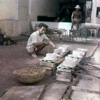 A young Vietnamese man crouches before a makeshift stove, using chopsticks make something (possibly cooking cassava). In the background, a man sits on a ledge, near two other men.
