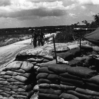 American soldiers walking along a dirt road towards a sandbag wall and tent. An open field is in the background.