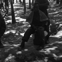 One American soldier is giving another soldier a haircut in a forest military camp. In the background are trees and more American soldiers.