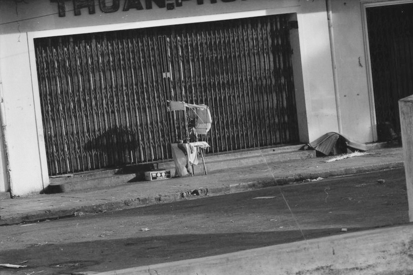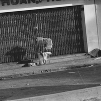 Original caption: "USAF -- B-57 - Danang." A laundry rack set up outside a closed shop, on the street. Clothes are draped over it. On the sidewalk beside it sits a box.