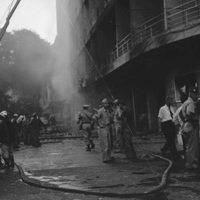 Original caption: "Pagoda" Men in uniform standing in a crowded alley. A hose lays in the street behind them. To the right rises a tall building. To the left is a parked car. This is probably from the bombing of the Victoria Hotel.