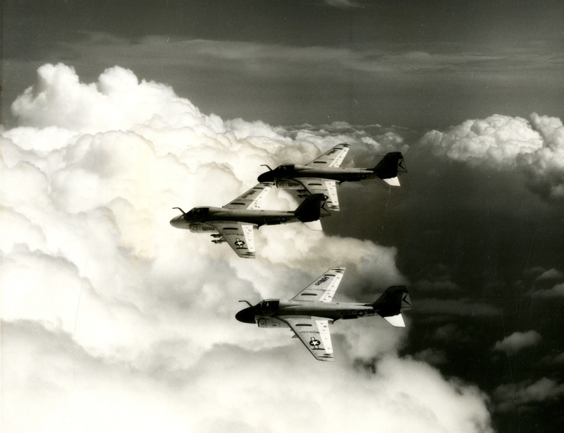 Original caption: "A6As returning from bombing mission over North Vietnam. The Squadron in which the A6As are from is VA-85 which is deployed aboard the USS Kitty Hawk." Three airplanes flying in formation over some clouds.