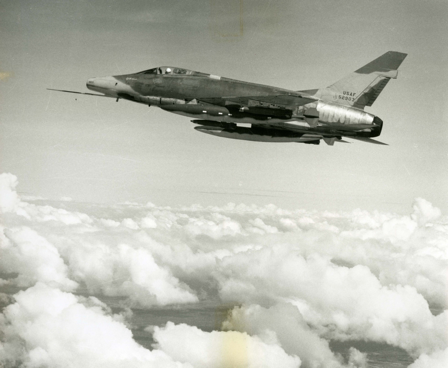 Original caption: "Saigon - F-100 Strikes - U.S. Air Force F-100 Supersabres have been bombing and strafing enemy positions with devastating results while supporting U.S. and allied units in South Vietnam. The Supersabres, equipped with 750-pound bombs, missiles and cannon are a versatile aircraft." A US Air Force jet in flight above clouds.