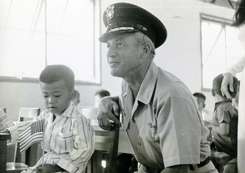 Original caption: "Gen. Anthis sits a moment with a patriotic young schoolboy." An American soldier sits next to a Vietnamese boy in a classroom. The boy has a small American flag.