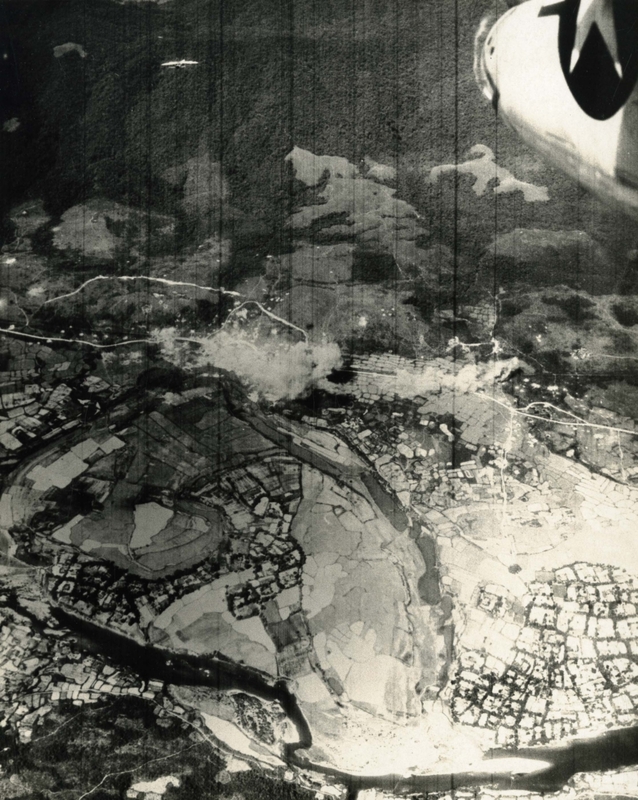 Original caption: "In the Tonkin Gulf - Navy Planes from the carrier air wing six strike the Trai Tranh Xom Highway Bridge on June 26, 1968." Aerial photo of a river through a rural area.