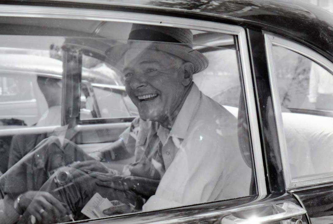 Henry Cabot Lodge Jr wearing a hat is seated inside of a vehicle. He smiles at the camera.