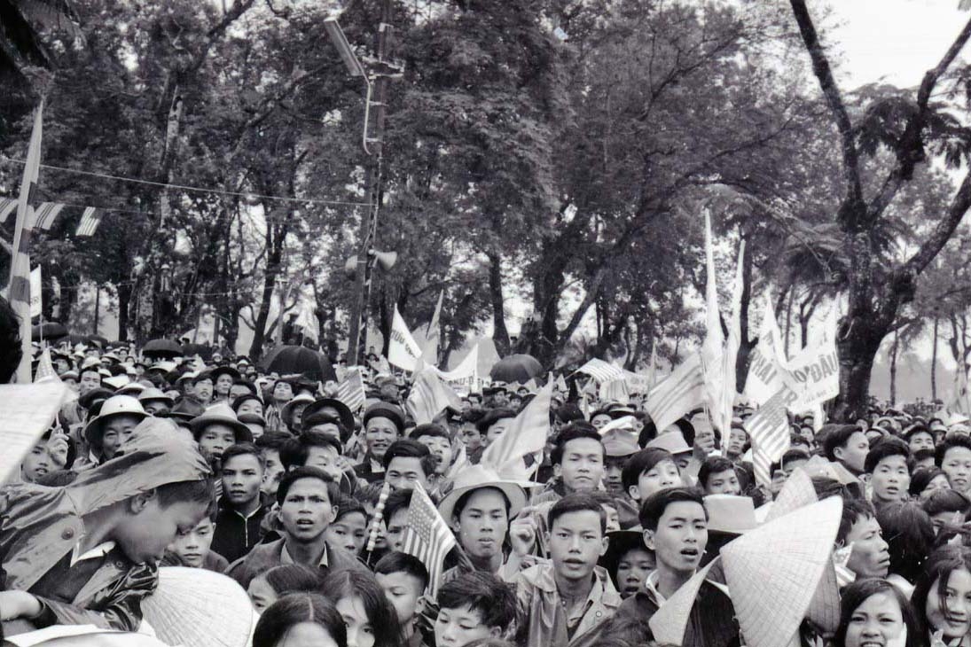 A crowd of Vietnamese people holding flags and banners. They have both American and South Vietnamese flags.