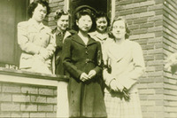 " 'Is that at right angles?' questions instructor T.T. Aakhus of Engineering Sophomore Takaro Nake in drawing class." caption courtesy of 1945 Cornhusker yearbook.