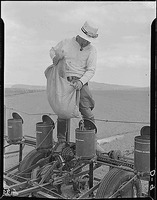 Tule Lake Relocation Center, Newell, California. John Matsumoto, 28, evacuee truck farmer putting seed peas in a pea drill at the relocation center. Caption and Photograph courtesy of The National Archives