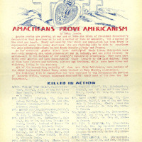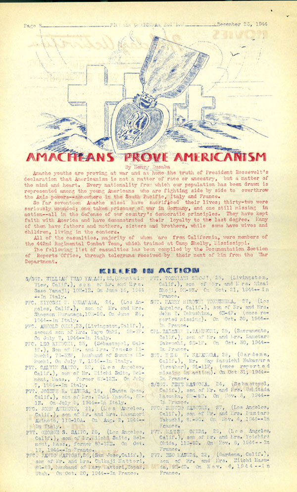 Amache youths are proving at war and at home the truth of President Roosevelt's declaration that Americanism is not a matter of race or ancestry, but a matter of the mind and heart. Every nationality from which our population has been drawn is represented among the young Americans who are fighting side by side to overthrow the Axis of powers - somewhere in the South Pacific, Italy and France.