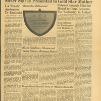 BRONZE STAR MEDAL to SGT. KATSUMI L. TAKASU - GI, LOS ANGELES Calif. - "... for heroic achievement during the assault on Biffontaine, France, on 22 October, 1944. Sergeant Takasugi was a member of a seven-man patrol which crossed two streets under hostile observation and fire and succeeded in capturing an enemy strongpoint, killing three and capturing eight of its defenders. In addition, two vehicles equipped with radios, and one loaded with rifles, were captured. That night the group was counter-attacked by the enemy in platoon strength supported by tanks and anti-tank guns. In the face of strong opposition offered by Sgt. Takasugi and the others the enemy was forced to withdraw."