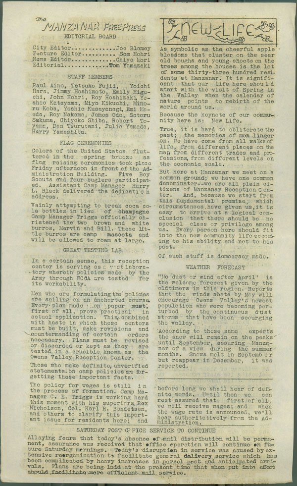 Colors of the United States fluttered in the spring breeze as flag raising ceremonies took place Friday afternoon in front of the Administration Building. Five Boy Scouts and four buglers participated. Assistant Camp Manager Harry L. Black delivered the dedication address.