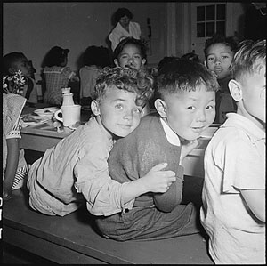 - San Francisco, California. Lunch hour at the Raphael Weill Public School, Geary and Buchanan Streets. Children of Japanese ancestry were evacuated with their parents to spend the duration in War Relocation Authority centers where educational facilities will be established. Caption and Photograph courtesy of The National Archives