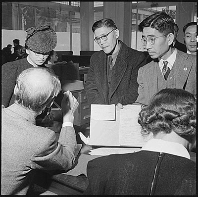 - San Francisco, California. Residents of Japanese ancestry file forms containing personal data, two days before evacuation, at Wartime Civil Control Administration station. Evacuees will be housed in War Relocation Authority centers for the duration. Caption and Photograph courtesy of The National Archives