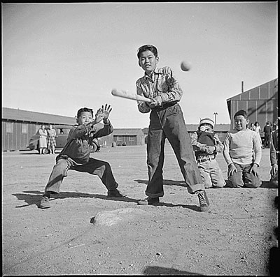 Manzanar Relocation Center, Manzanar, California. Sixth grade boys enjoy a game of softball at recess time. Note boys in rear who mistrust control of the "speed ball" pitcher. Caption and Photograph courtesy of The National Archives - Language