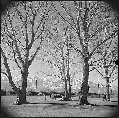 - Manzanar Relocation Center, Manzanar, California. A view on the main firebreak at this War Relocation Authority Center, for evacuees of Japanese desecnt. In the background is seen the Sierra Nevada range of mountains, and in the foreground, a rabbit hutch, which houses pets of some of the children. Caption and Photograph courtesy of The National Archives