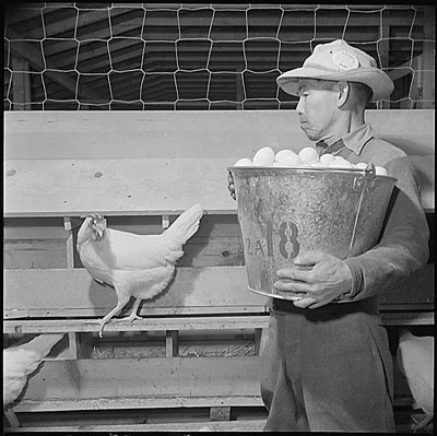 - Tule Lake Relocation Center, Newell, California. S. Uyeda, evacuee from Auburn, Washington, is shown gathering eggs on the poultry farm here. Uyeda owned his own poultry business which consisted of 2,000 chickens. He operated this farm for 10 years. Caption and Photograph courtesy of The National Archives
