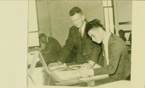 - " 'Is that at right angles?' questions instructor T.T. Aakhus of Engineering Sophomore Takaro Nake in drawing class." caption courtesy of 1945 Cornhusker yearbook.