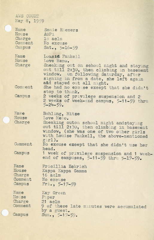 There were various infringements, including not signing in or out of the residence hall or sorority house, or being late on week nights and weekends. The girls who attended the AWS Court were asked to comment on their infringements and the committee would decide if the women were to be excused or not.