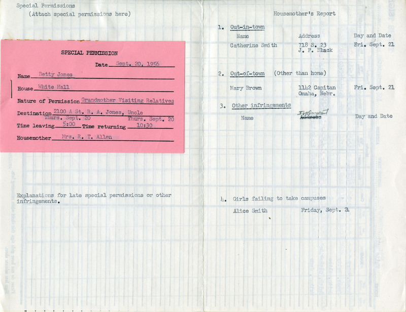 Here is an example of the AWS Court Minutes from 1959 in which two girls were caught sneaking back into the dorms after curfew and a sign out sheet from 1956.