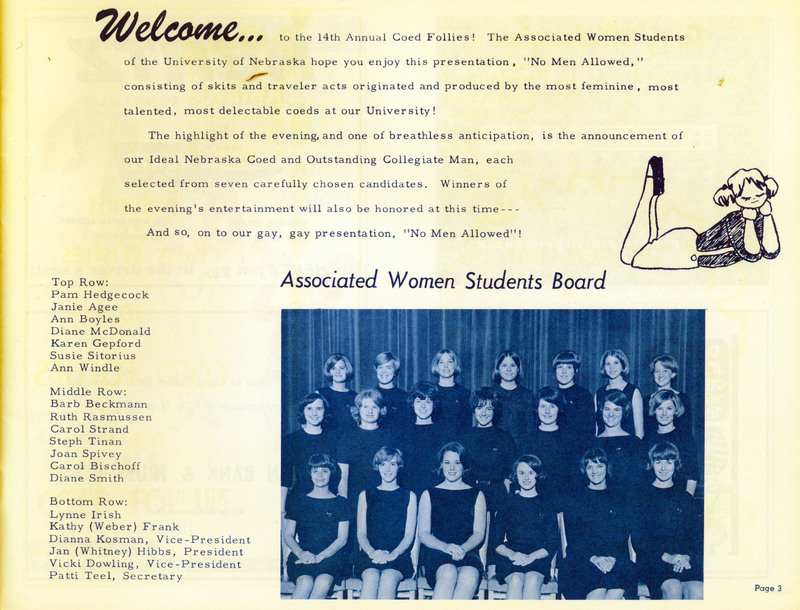 "Welcome to the fourteenth annual Coed Follies! The Associated Women Students of the University of Nebraska hope you enjoy this presentation of "No Men Allowed," consisting of skits and traveler acts originated and produced by the most feminine, most talented, most delectable coeds at our university!