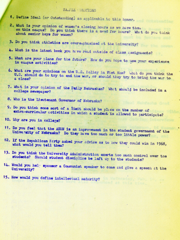 - This is a list of sample questions to ask the finalists for the Ideal Nebraska Coed and Outstanding Collegiate Man titles. Along with an application, answers to these questions helped the judges to select the winners.