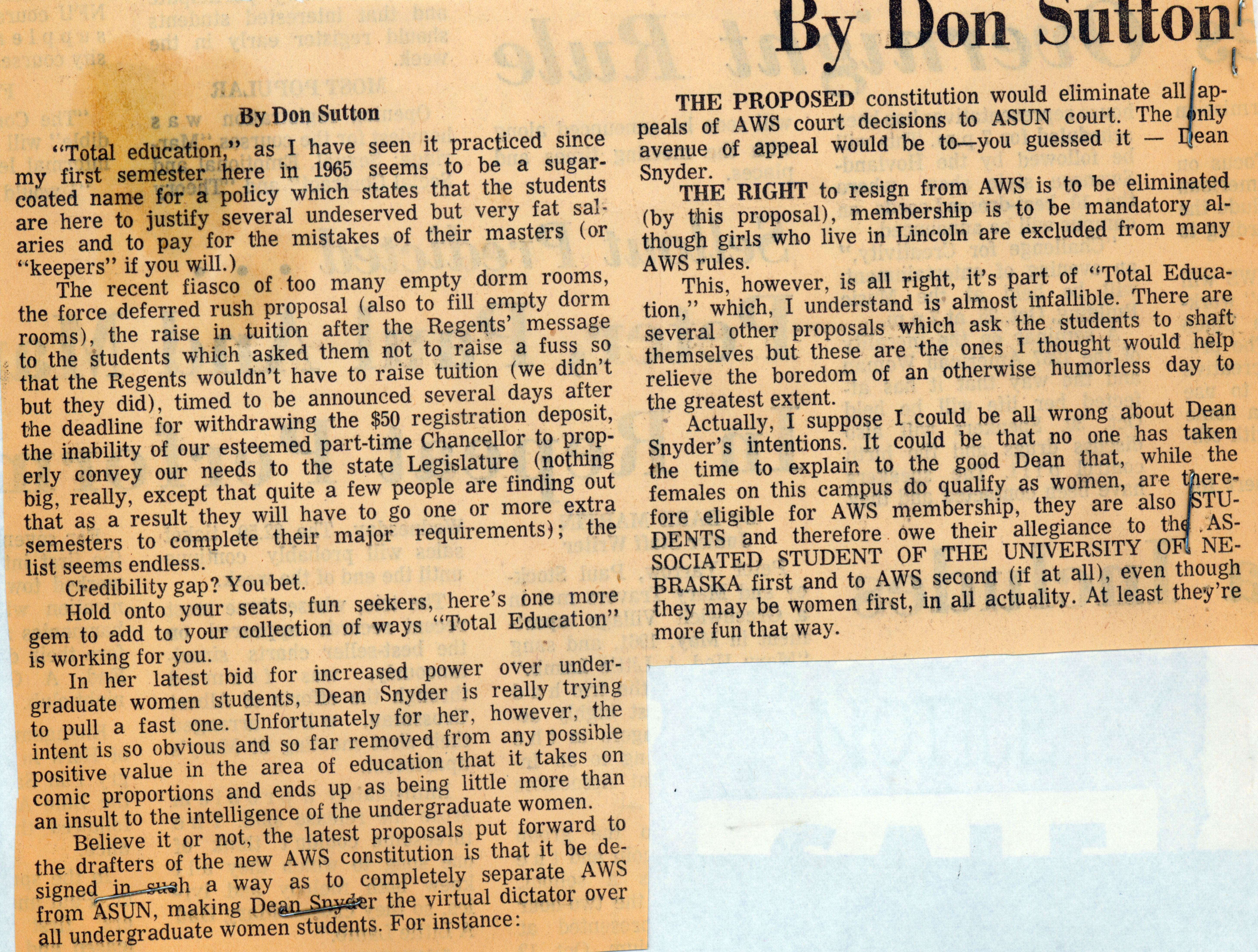 This is an editorial piece written in the late 1960s for the Daily Nebraskan by Don Sutton about the AWS. It discusses the Constitutional Convention and the struggle to insure that the AWS did not become a separate entity from the ASUN, which was the supposed view of Dean Snyder, described as "the virtual dictator over the undergraduate women students".