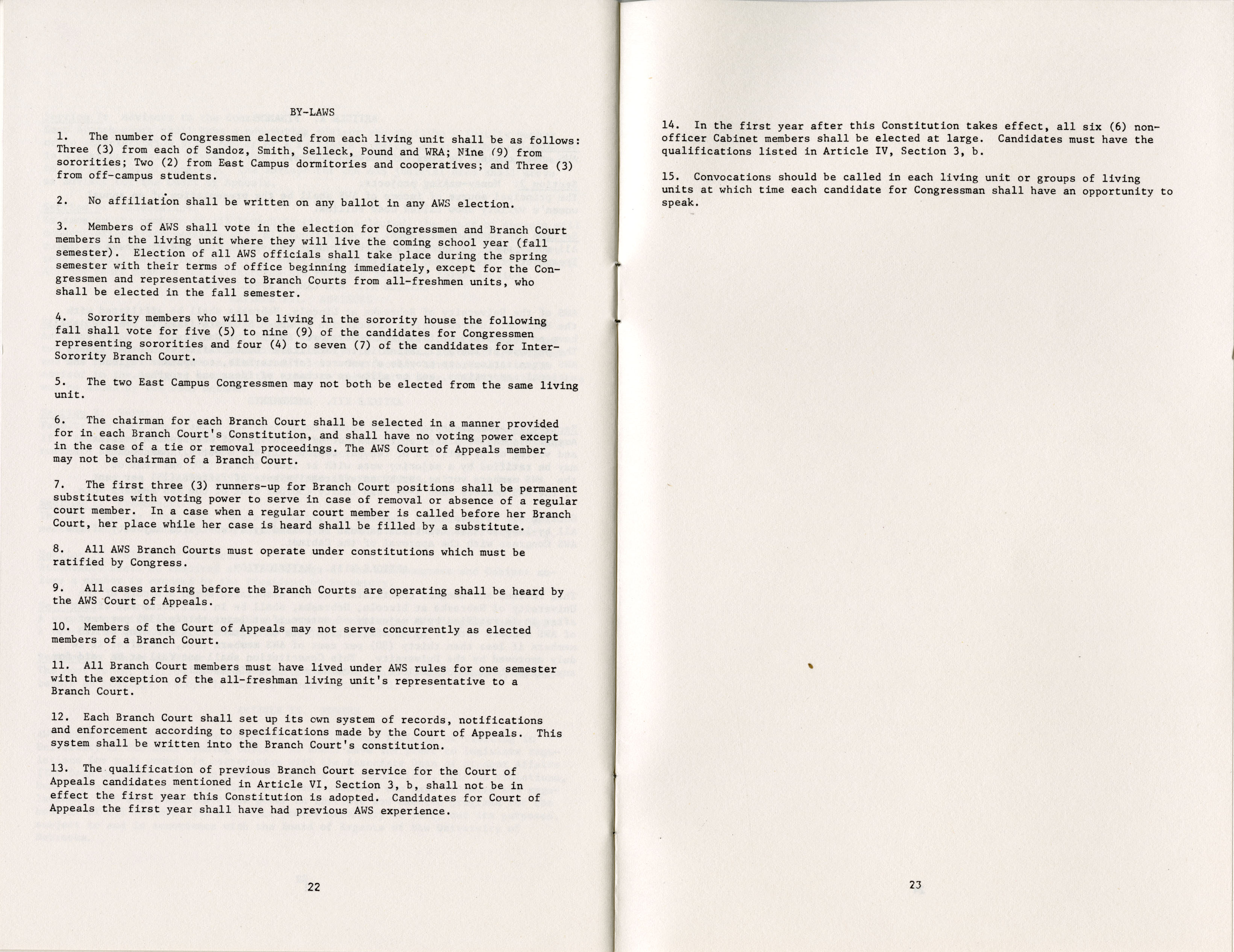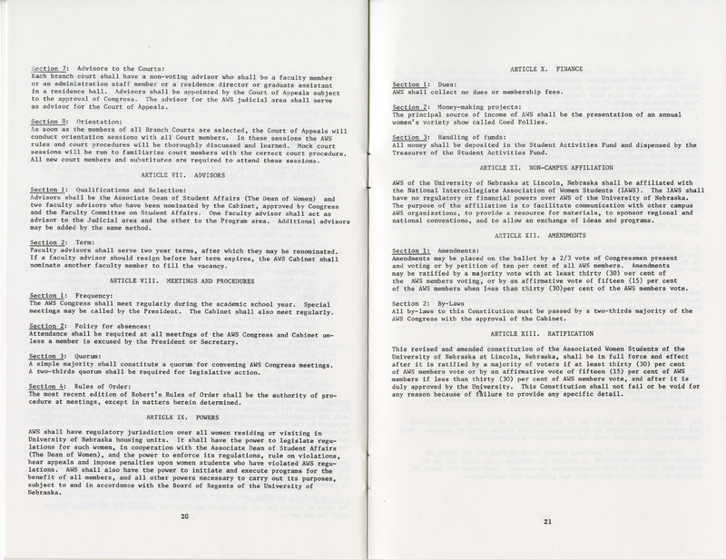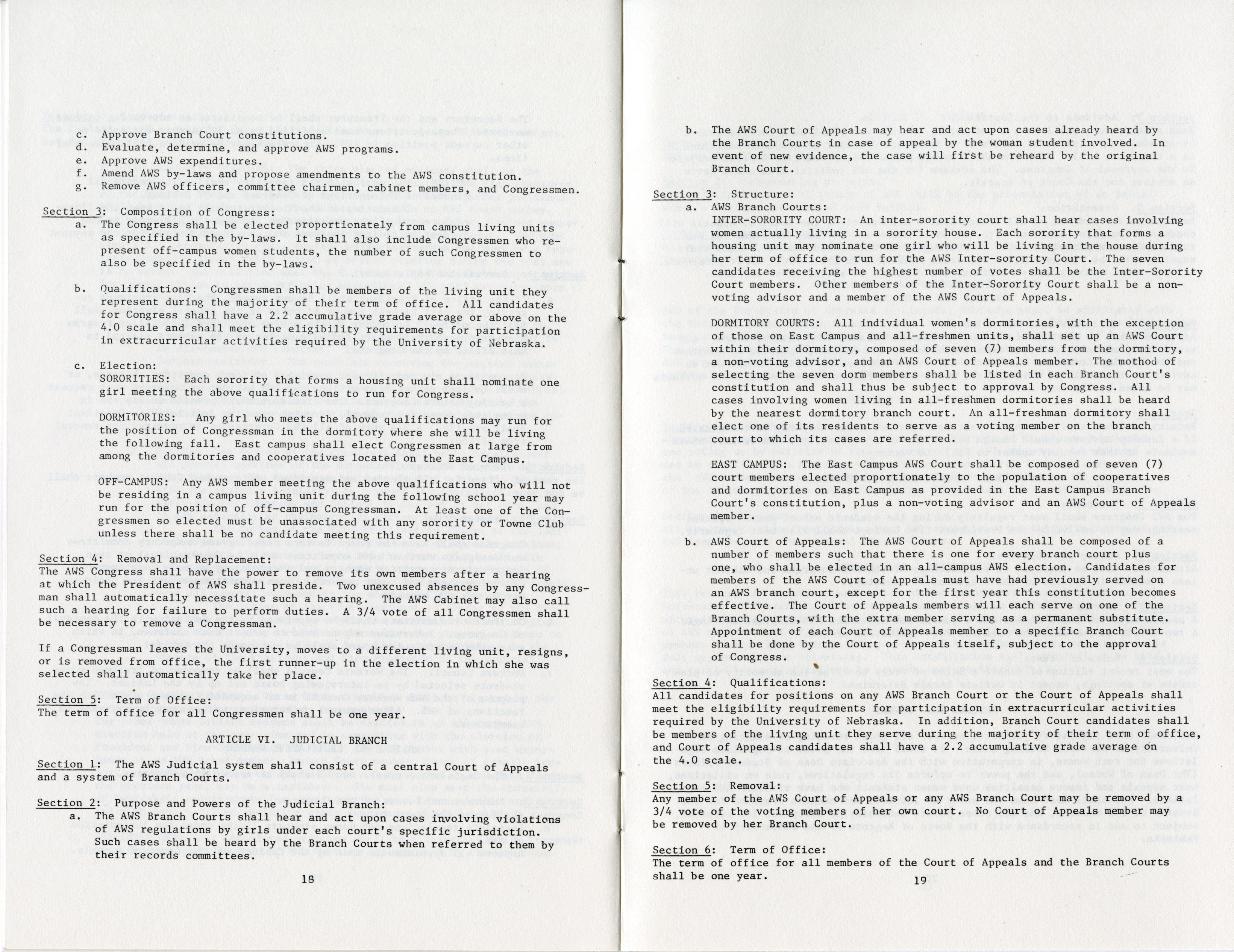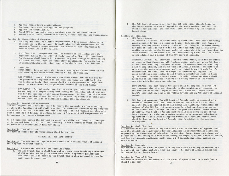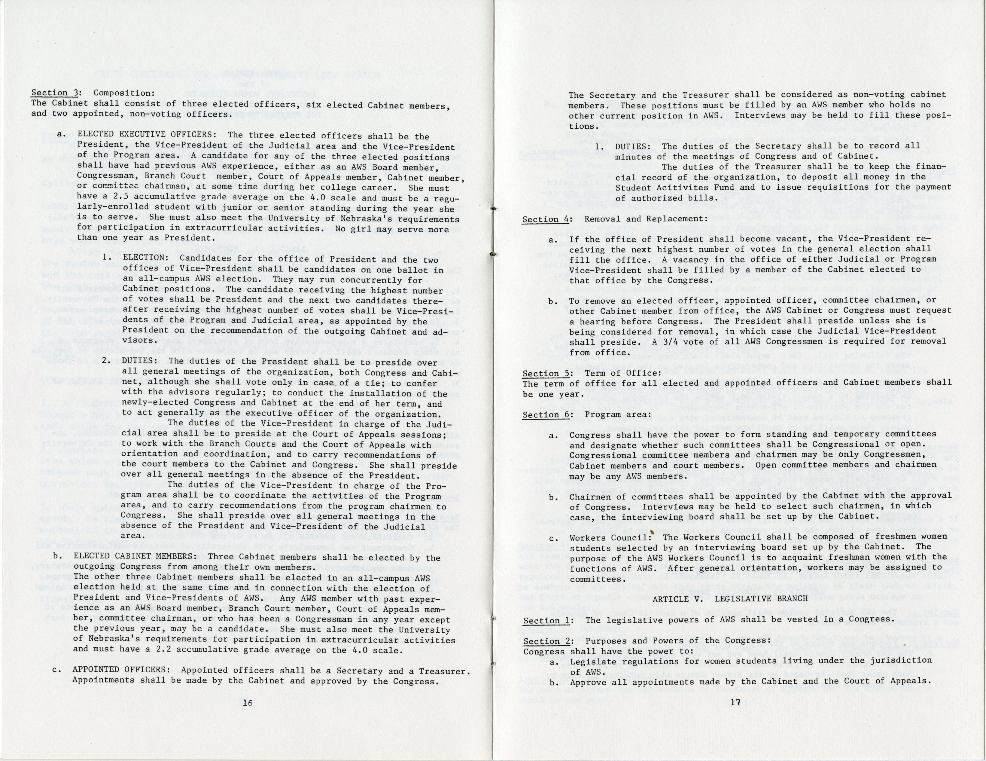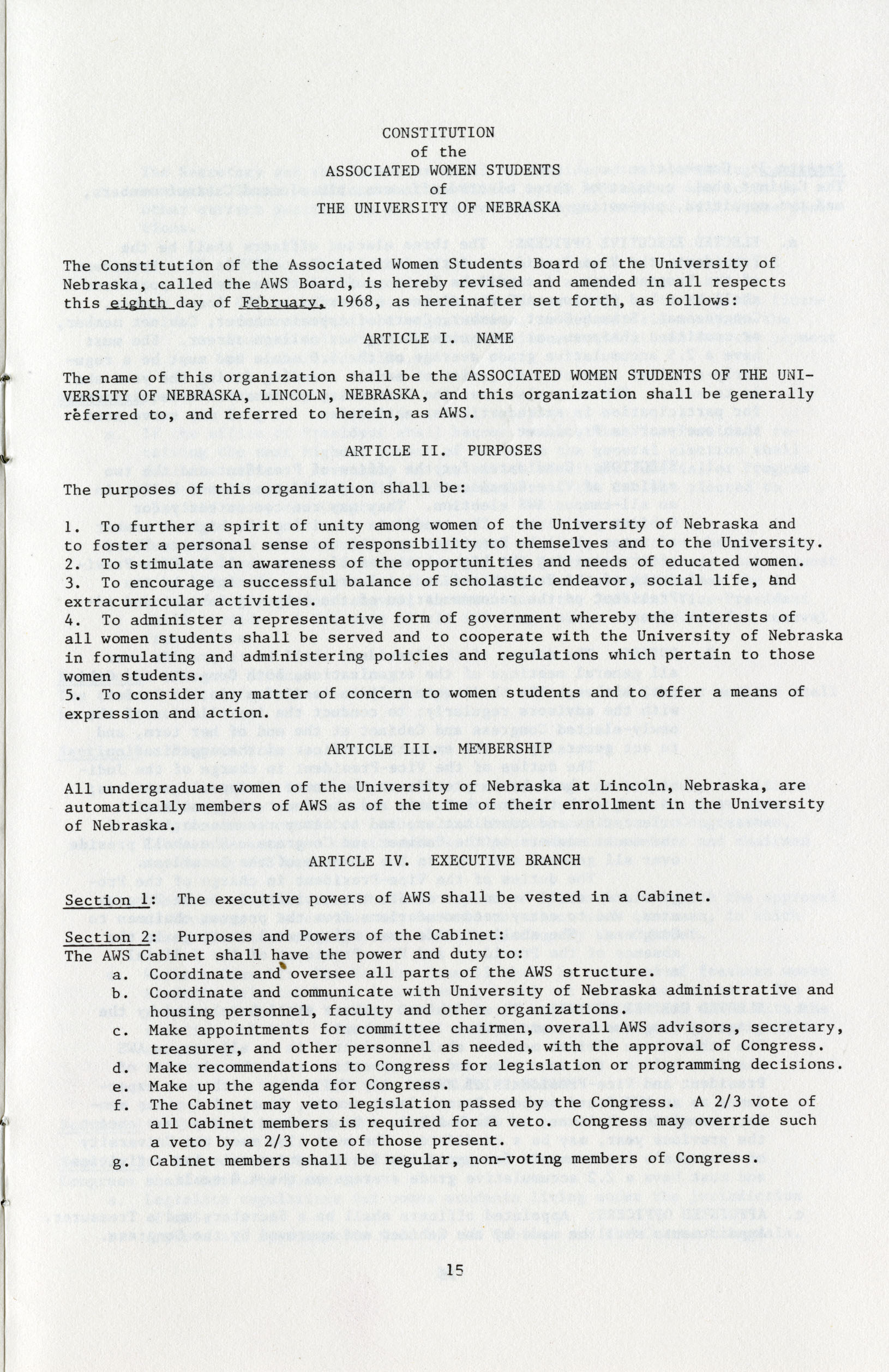 4. To administer a representative form of government whereby the interests of all women students shall be served and to cooperate with the University of Nebraska in formulating and administrating policed and regulations which pertain to those women students.