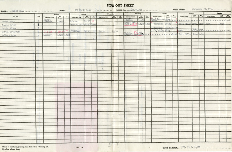 - This document is a sign out sheet for White Hall on of the female residence halls on the Nebraska campus. It also includes a Housemother's Report allowing special permission for one female student to visit her relatives out of town.