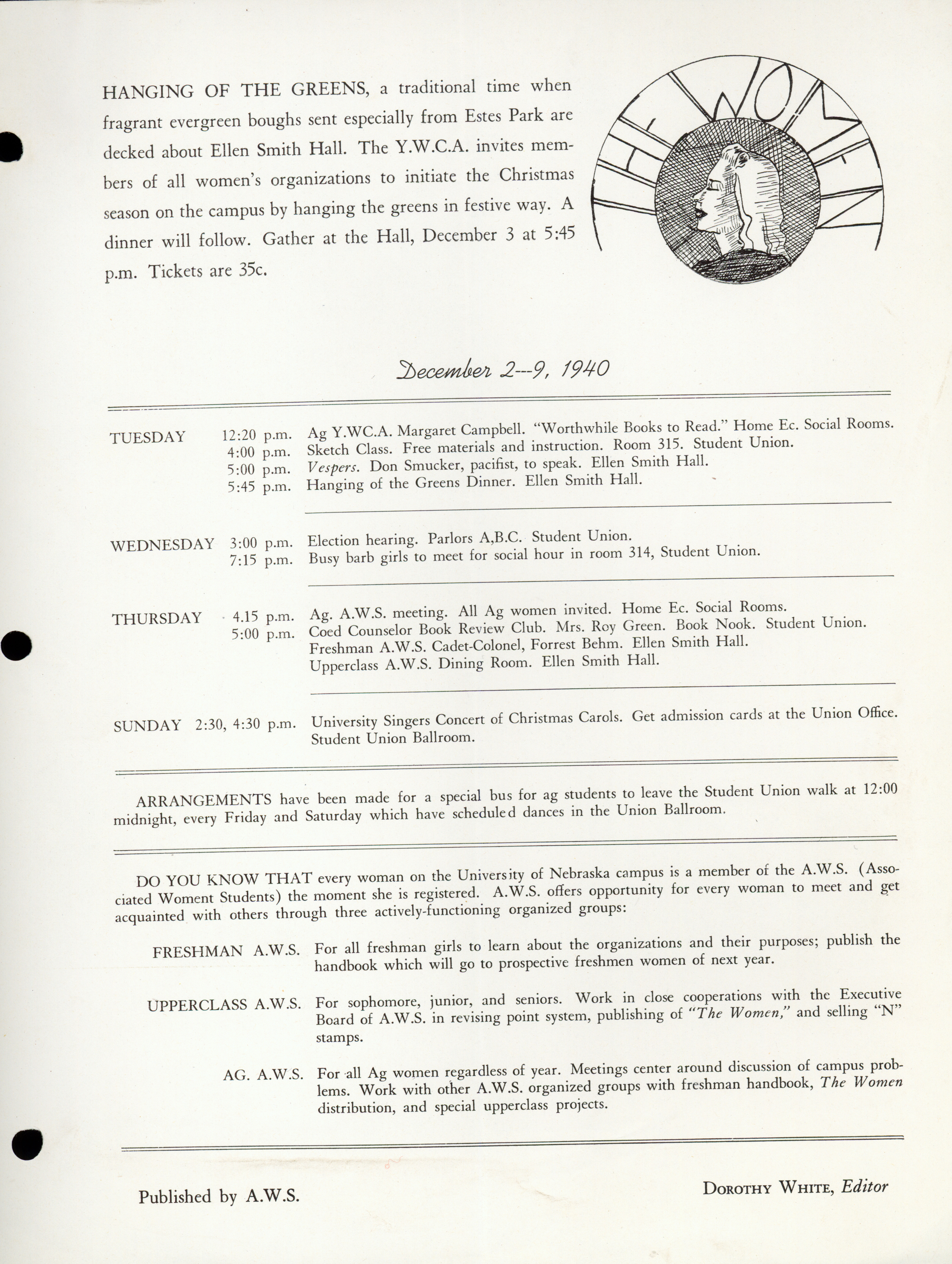 - This is an issue of a series of weekly calendars created by the AWS to encourage female students to become more active on campus. "The Women" began publication in October of 1940 and only had eleven issues before it was discontinued. "The Women" was edited by Dorothy White.