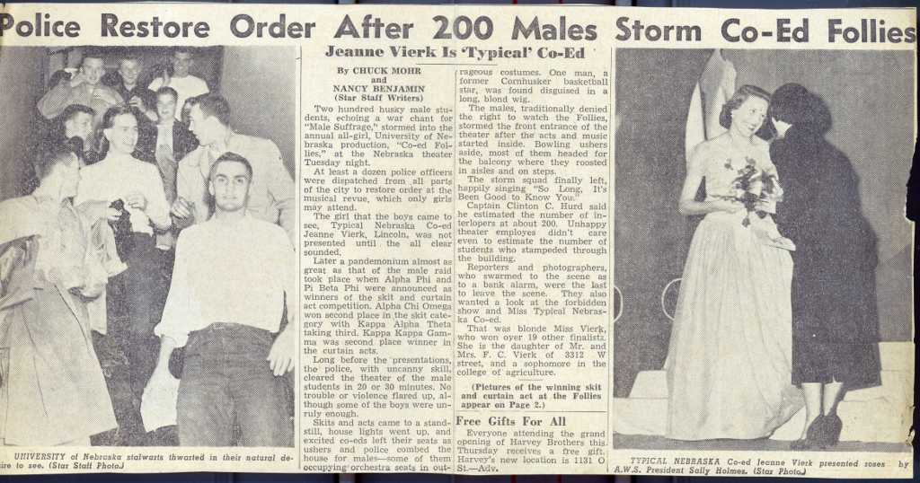 - This is an article from the Daily Nebraskan from 1952 describing the incident in which 200 male students invaded the all girls event, the AWS Coed Follies.