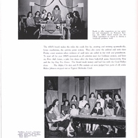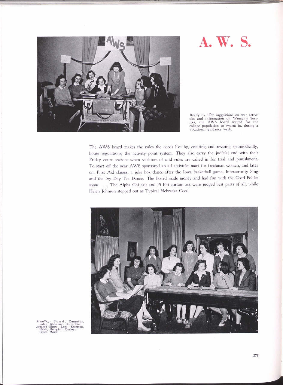 "The AWS board makes the rules the coeds live by, creating and revising spasmodically, house regulations, the activity point system. They also carry the judicial end with their Friday court sessions when violators of said rules are called in for trial and punishment. To start of the year the AWS sponsored an all activities mart for freshman women, and later on, First Aid classes, a juke box dance after the Iowa basketball game, Intersorority sing and the Ivy Day Tea Dance. The Board made money and had fun with the Coed Follies show....Alpha Chi skit and Pi Phi curtain act were judged the best parts of all, while Helen Johnson stepped out as Typical Nebraska Coed."