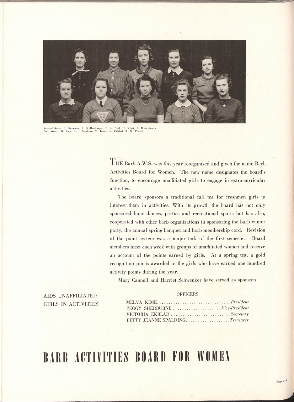 This is a page from the 1940 Cornhusker Yearbook that shows the Barb Activities Board for Women. This was a group that the Associated Women Students (AWS) created for women who were unaffiliated with the sororities on campus. Sorority women on the Nebraska campus tended to be more involved in other campus activities, it was the Barb Activities Board that helped to promote unaffiliated women to become involved on campus.