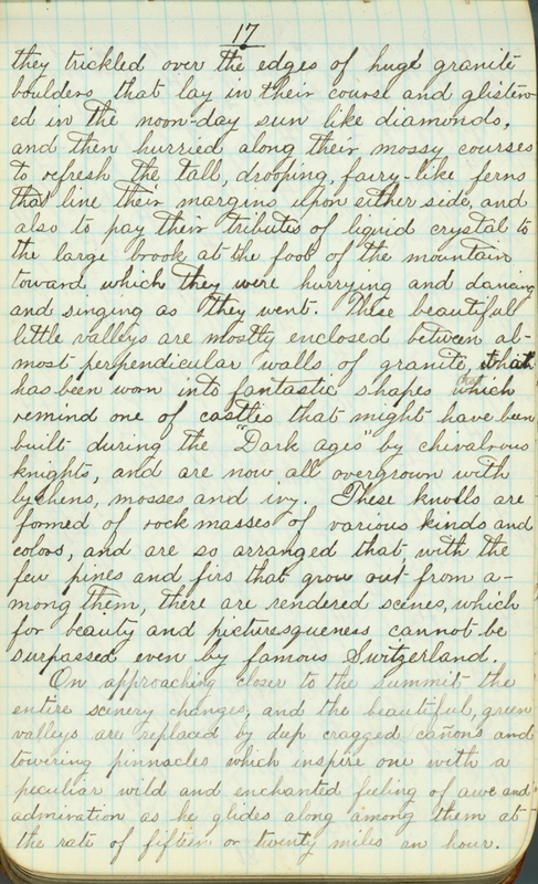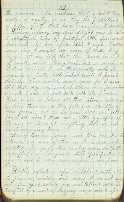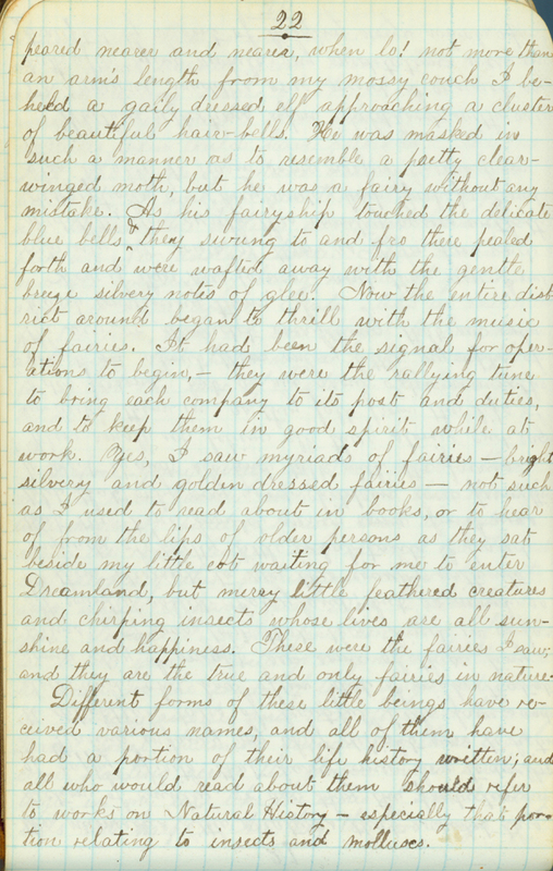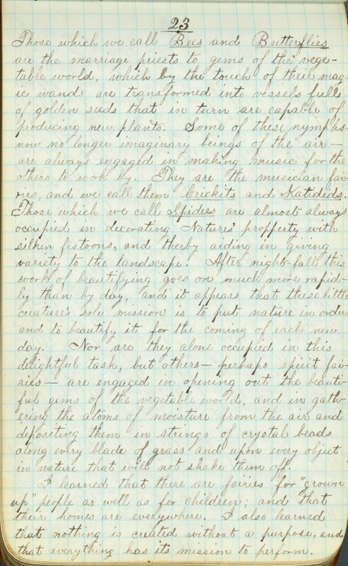 the musician fairies, and we call them Crickets and Katidids. Those which we call Spiders are almost always occupied in decorating Nature’s propperty with silken festoons, and therby aiding in giving variety to the landscape. After night-fall this work of beautifying