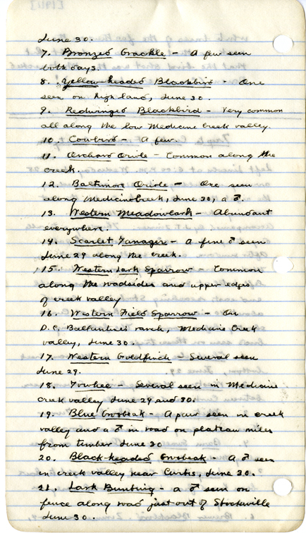 - 16. Western Field Sparrow - On D. C. Ballantine's ranch, Medicine Creek valley, June 30. 17. Western Goldfinch - Several seen June 29.