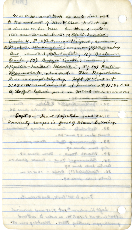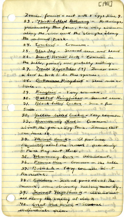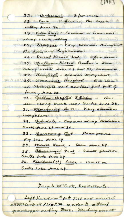 - Left Lincoln at 6:00 p.m. Wednesday June 28 arriving in Holdrege at 10:20 and speding the night there, then on to Curtis the next morning where we arrived at 11:30 a.m. Accompanied by J. T. Zimmer. Thursday, a terrible day, temperature 110 degrees and hot south gale. After sundown autoed southwest along Medicine Creek. Friday morning June 30 left hotel at 8:00 a.m. and autoed south and east, reaching Stockville. Covered about 40 miles, reaching hotel at Curtis shortly before noon. The following birds seen on these trips: