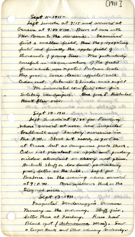 - Sept. 12 - 1911 Left Lincoln at 9:40 for Fairbury where arrived at noon and inspected Galbraith and Fairbury nurseries in the P.M. Stock not nearly as good as at Geneva but no dangerous pests there. Cedar rust prevalent on apple and powdery mildew abundant on cherry and plum. Harburt's stuff on low land particularly poor, better on the hill. Left for Beatrice in the evening where arrived at 9: P.M. Barn swallows thick on the telegraph wires.
