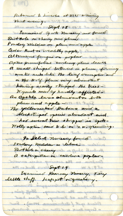 - Sept. 18 Examined York Nursery and found Shothole on cherry and plum Powdery Mildew on plum and apple Cedar Rust on wealthy apple Altermana fungus on poplar Aphis prunifoliae curling plum leaves A small striped torbucid on plum forming winter nests like the leaf crumpler and on the Wolf plum very abundant having nearly stripped the trees - Wyants nearby hardly affected. An Apatila larva abundant on both plum and apple -