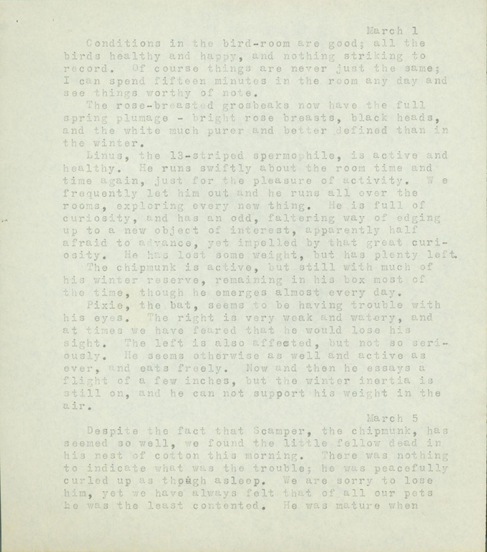 Despite the fact that Scamper, the chipmunk, has seems so well, we found the little fellow dead in his nest of cotton this morning. There was nothing to indicate what was the trouble; he was peacefully curled up as though asleep. We are sorry to lose him, yet we have always felt that of all our pets he was the least contented. He was mature when